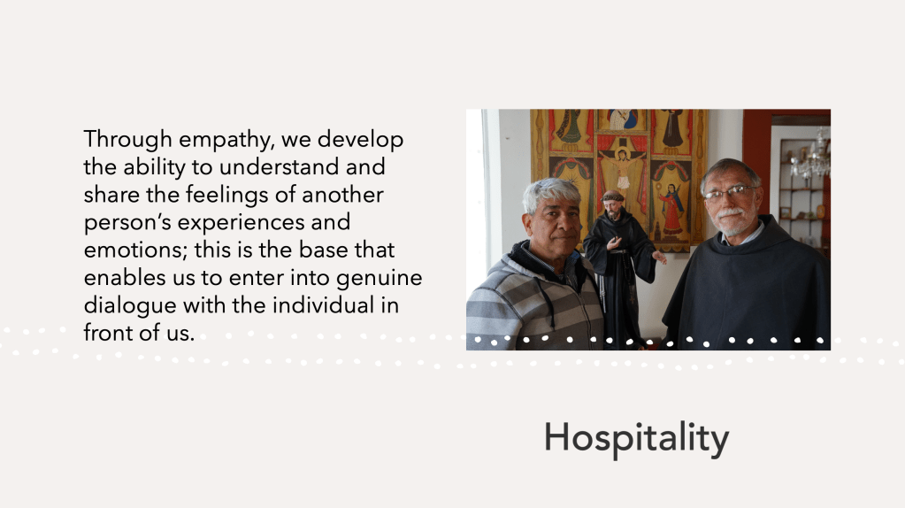 Hospitality has become a common practice within a variety of secular initiatives for migrants: from sharing people’s lives and having social concern for them to working in a private and public sphere for their inclusion. These initiatives meet the many needs of migrants but do not address spiritual needs or a sense of belonging; creating a hospitality culture within our faith communities is a significant challenge. Marion Larson and Sara Shady working on the writings of Martin Buber have found that empathy can help a community move toward inclusion of the diverse other. Through empathy, we develop the ability to understand and share the feelings of another person’s experiences and emotions; this is the base that enables us to enter into genuine dialogue with the individual in front of us. This perspective is very similar to the theological perspective expressed by Susan B. Parlow when extending the work of Karl Rahner that developing empathy is critical for having communion. These are Parlow’s words: