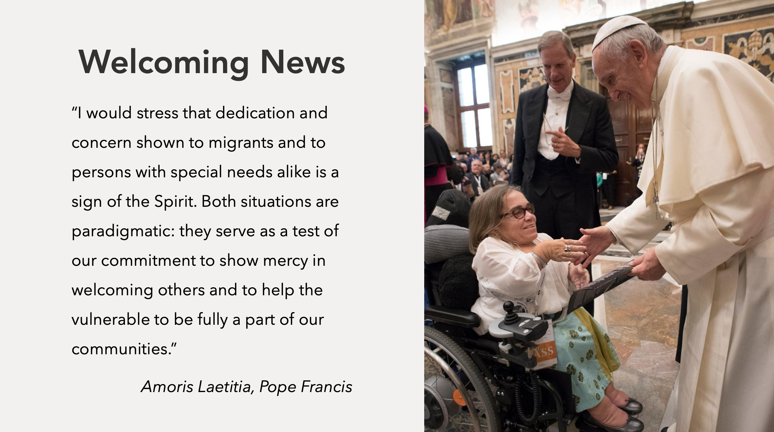 Both situations are paradigmatic. They serve as a test of our commitment to show mercy in welcoming others. They also help the vulnerable to be fully a part of our communities” (AL 47). In these two sentences, Pope Francis first arises an absolute novelty in the Church Magisterium. He refers to persons “with special needs” (and not “with disabilities”). Second, he associates them with migrants. Third, he reinforces the idea that both are invited to become full parts of Christian Communities. From this point, the biblical figure best representing the person with a disability would not be the sick. It would not be the little one either. Rather, it would be the stranger. If this new perception settles permanently, the Service for Pastoral Care of Migrants soon include the pastoral care of persons with disabilities. The new perception could become permanent. Then, the Service for Pastoral Care of Migrants could soon include the pastoral care of persons with disabilities. This service’s mission is to humanize the encounter with foreigners. It also aims to promote solidarity with the brother and sister in trouble. Moreover, it encourages local churches to welcome all of foreign origin. This paper aims to connect “migrant” with “disability.” It presents a program from the Inclusive Design Research Centre for Pastoral Welcoming and Inclusion in faith communities.